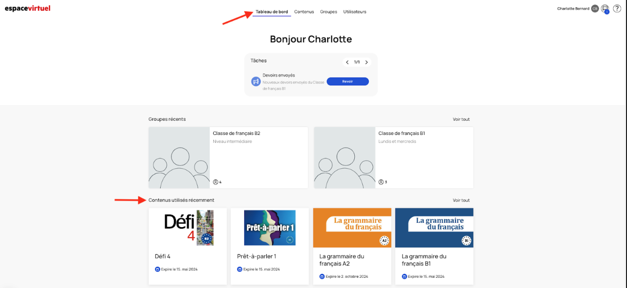 On the Dashboard/Tableau de bord you will only see the four textbooks or resource banks you have most recently accessed.
