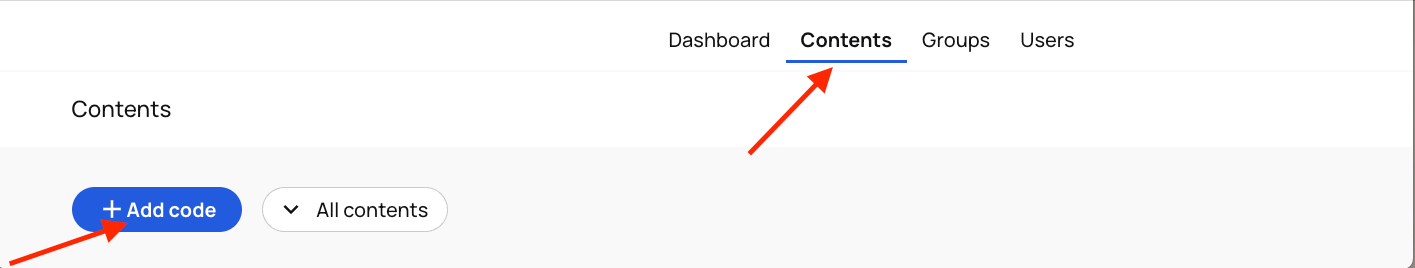 To activate the content, click on the Contents tab, then on the blue + Add code button, and enter the code.