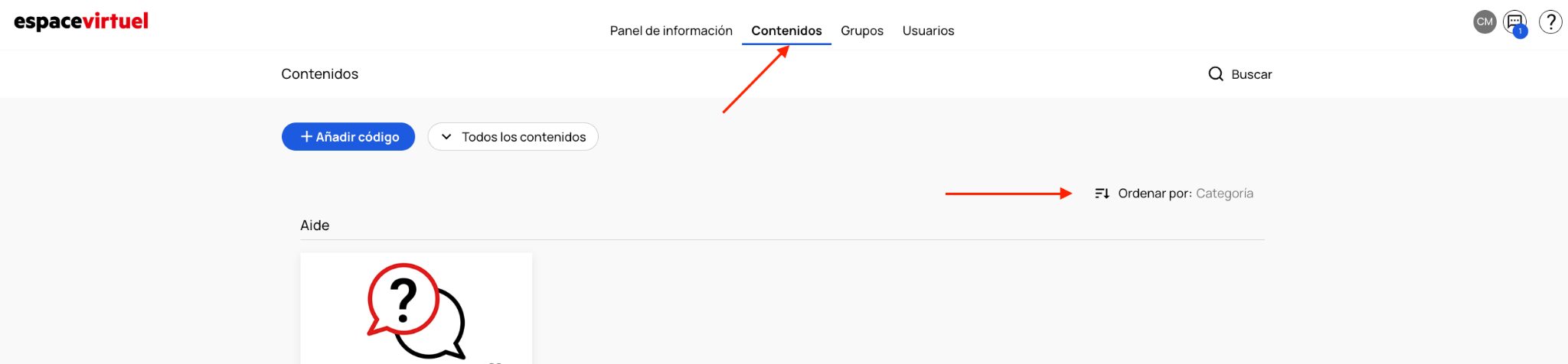 Tu orden de preferencia para visualizar en la pestaña “Contenidos” puede haber sido modificado y puedes configurarlo nuevamente según tus preferencias (por categoría, último acceso, fecha de publicación, etc.) haciendo clic en “Ordenar por” (debajo del botón azul “+ añadir un código”).