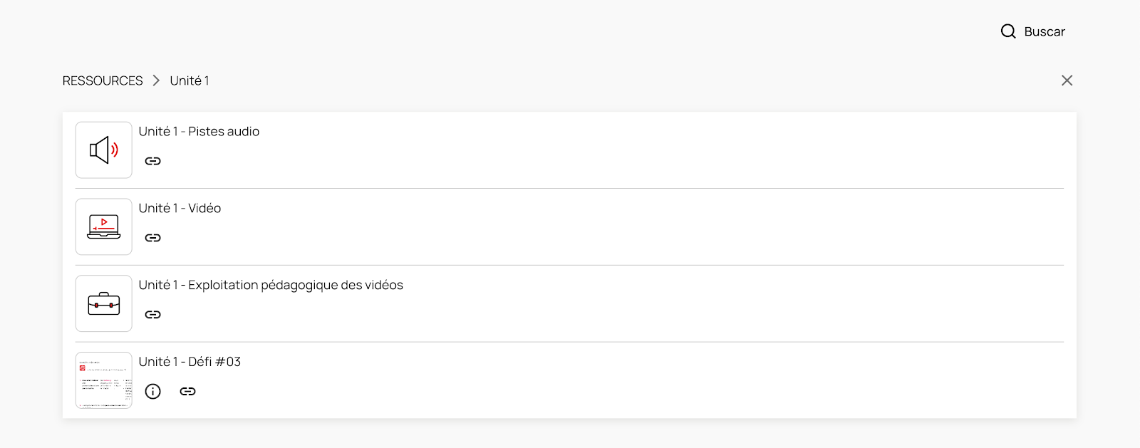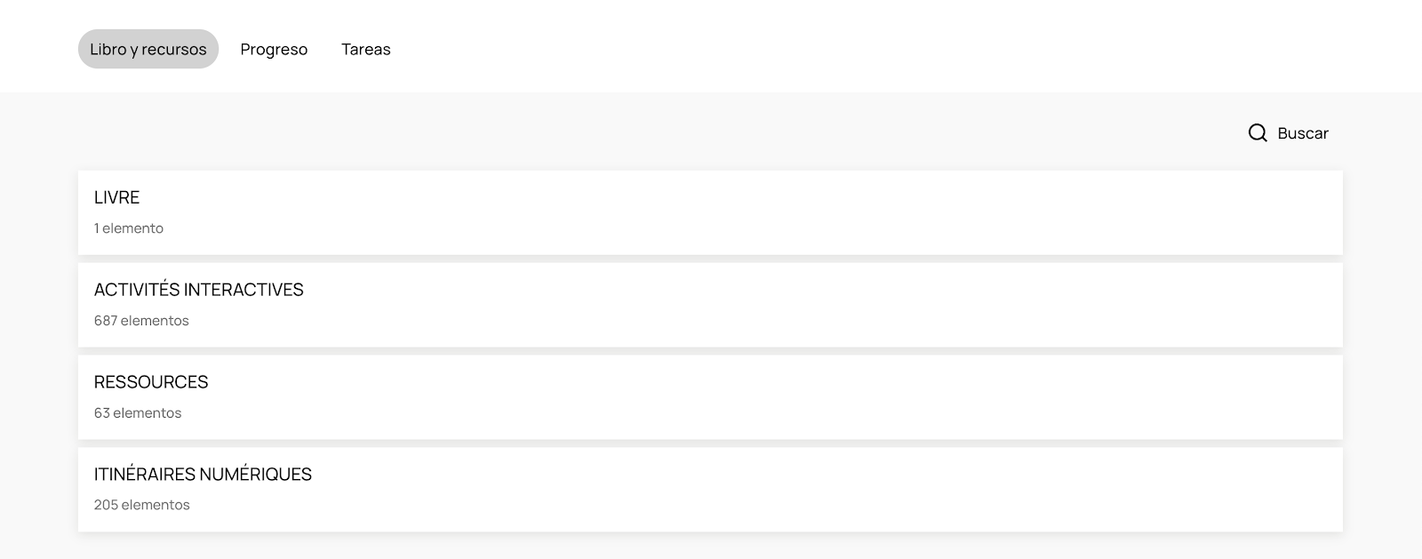 Puedes igualmente filtrar por contenidos activos seleccionando Activo.Para visualizar los contenidos, haz clic en el manual o banco de recursos al que quieras acceder y haz clic en la pestaña “Libor y recursos”. Los contenidos están organizados en distintas carpetas, que aparecen como bloques rectangulares que se despliegan al hacer clic en ellos.