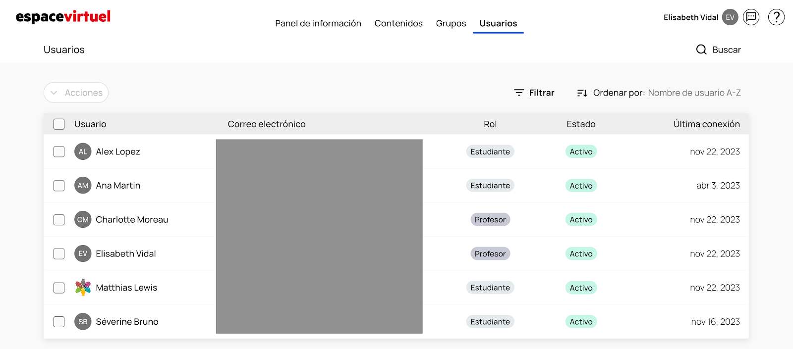 Finalmente, las cuentas con rol de docente verán también la pestaña "Usuarios", donde podrán encontrar un listado de todos los estudiantes o profesores que forman parte de sus grupos, consultar información relacionada con sus cuentas (última conexión, fecha de creación, contenido activado, etc.) e iniciar conversaciones de chat o videollamadas con cada usuario.