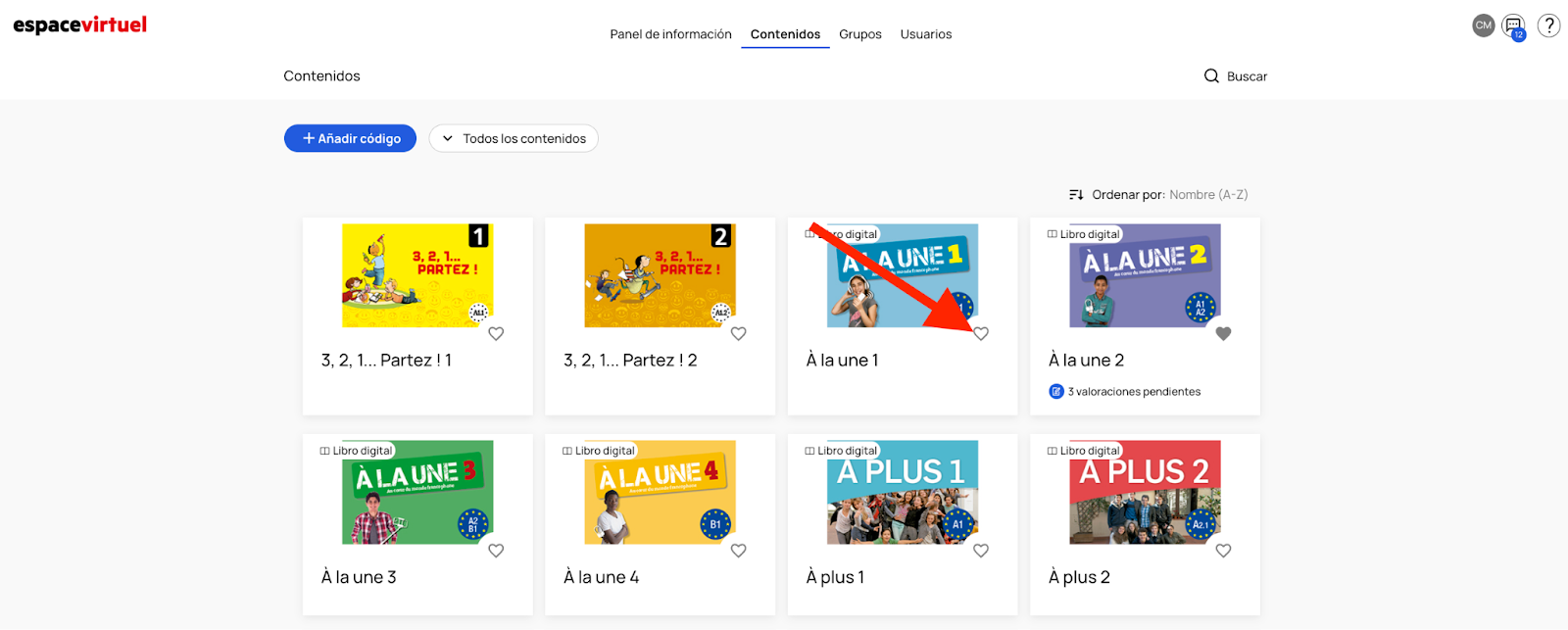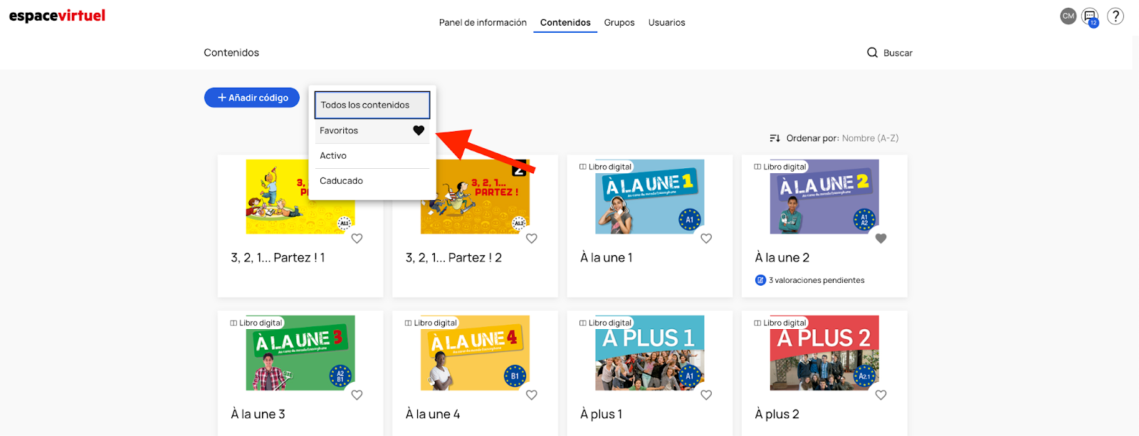 Podrás acceder directamente a tus recursos favoritos haciendo clic en Todos los contenidos y luego en Favoritos.