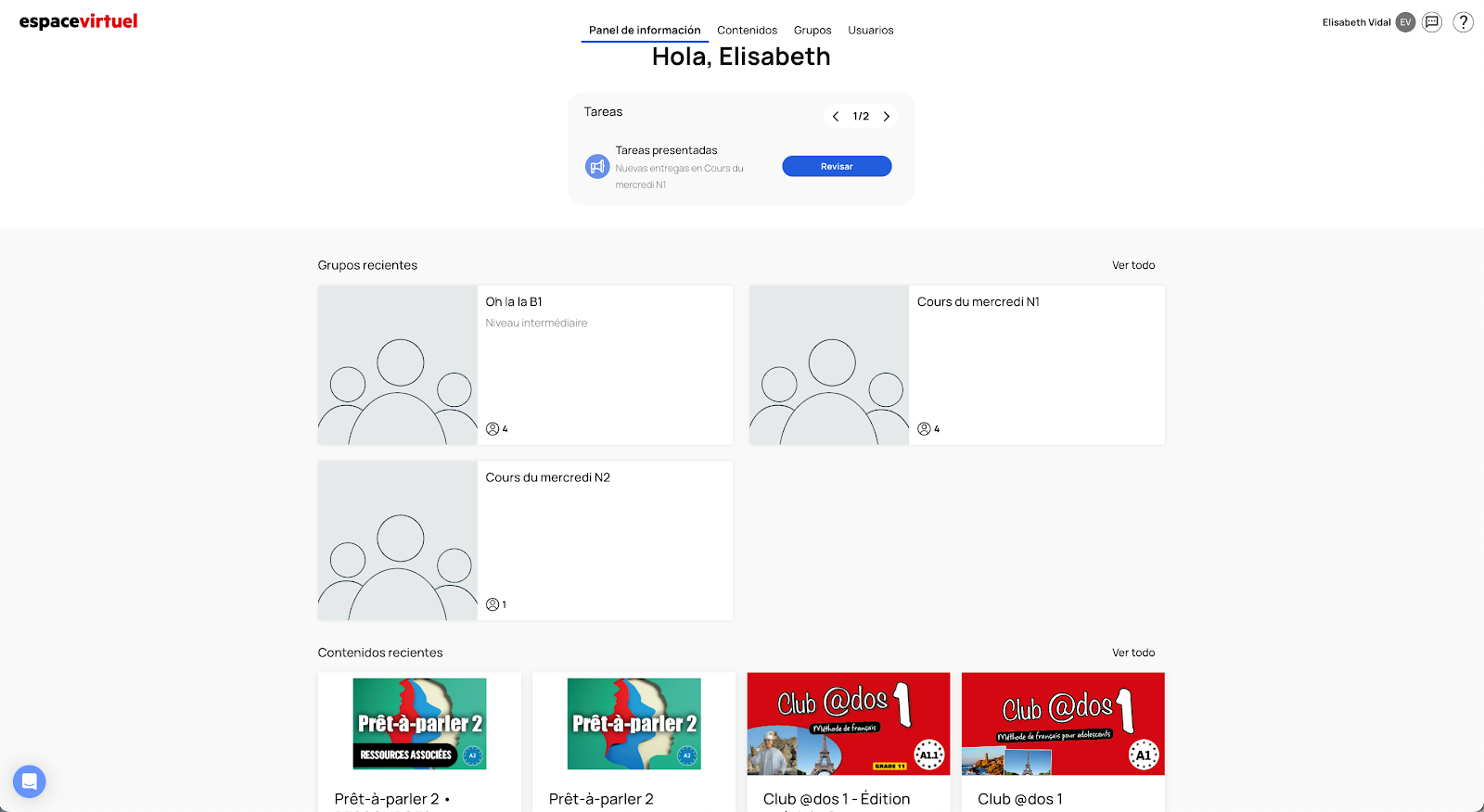 Tras abrir tu sesión en Espace virtuel, verás la pantalla "Panel de información". Si es la primera vez que accedes a la plataforma, verás un mensaje invitándote a añadir un código para unirte a un grupo o para activar contenido. Si ya tienes contenidos y/o grupos en tu perfil, en el Panel de información verás los 4 grupos y 4 manuales a los que hayas accedido más recientemente. En la parte superior de la pantalla verás también el carrusel de notificaciones, donde recibirás mensajes relacionados con tus tareas, grupos y contenidos (por ejemplo, a los estudiantes se les avisará cuando su profesor les haya asignado o corregido una tarea y a los profesores, cuando sus estudiantes hayan enviado actividades que requieran de corrección manual).