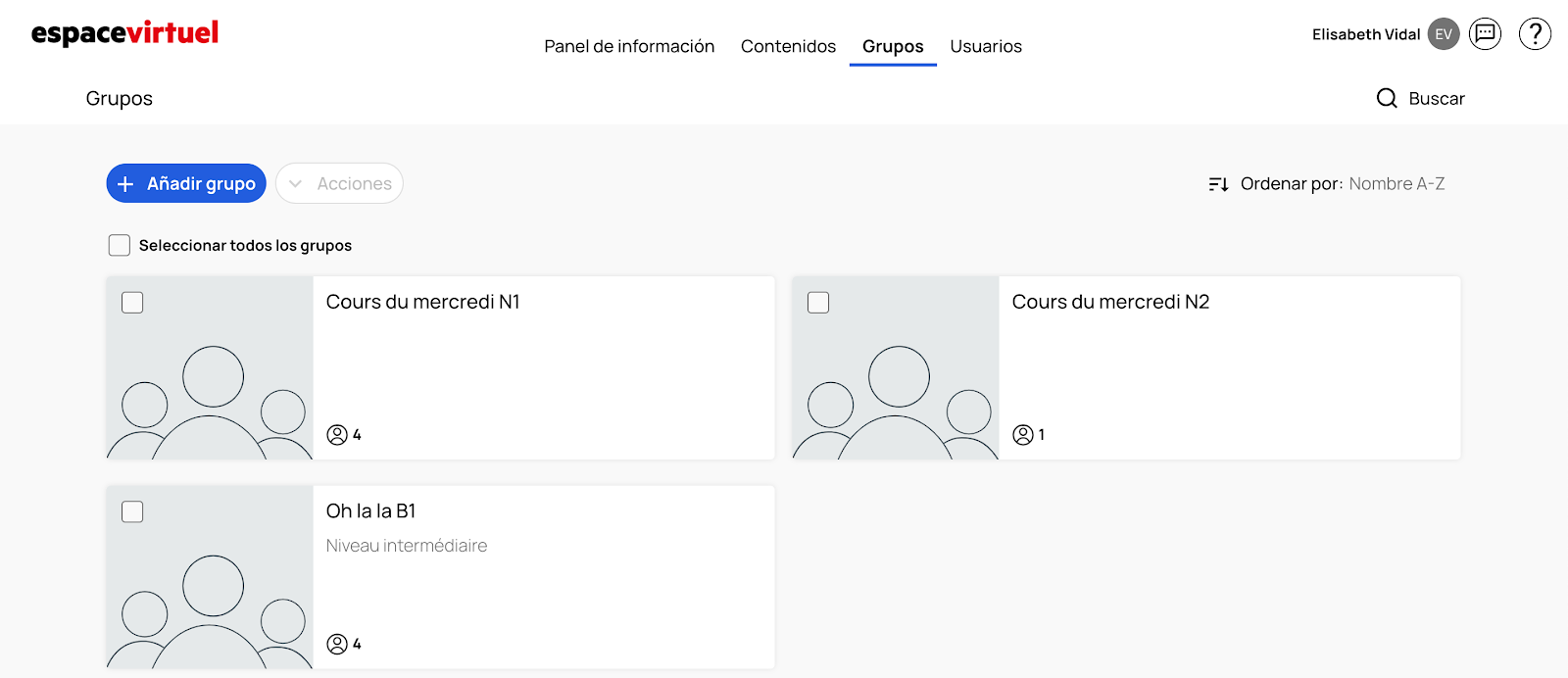 Desde la pestaña "Grupos" podrás acceder a todas las funcionalidades relacionadas con los grupos. Los profesores podrán crear y editar sus grupos. Dentro de cada grupo, podrán asociarle contenido al grupo, asignar tareas, seguir el progreso de los miembros del grupo en las actividades que hayan completado independientemente e iniciar conversaciones de chat y videollamadas con el grupo completo. Los estudiantes podrán acceder al contenido asociado al grupo (siempre que hayan activado ese contenido desde sus cuentas), consultar y completar sus tareas, seguir su progreso en las actividades que hayan completado independientemente e iniciar conversaciones de chat con su profesor o con todo el grupo.