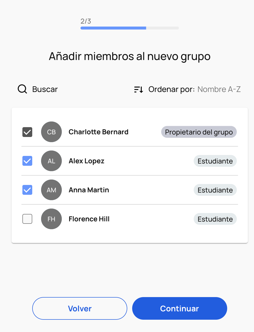 Después de hacer clic en "Continuar", tendrás que añadir miembros al nuevo grupo. Solo aparecerán aquí los estudiantes que estén en tu lista de usuarios porque ya pertenezcan a otro de tus grupos. Si tienes muchos estudiantes, podrás buscarlos y filtrarlos. Si aún no tienes estudiantes que sean parte de un grupo, no aparecerán aquí. En ese caso, simplemente haz clic en "Continuar" y sigue creando el grupo aunque de momento solo te tenga a ti como miembro.
