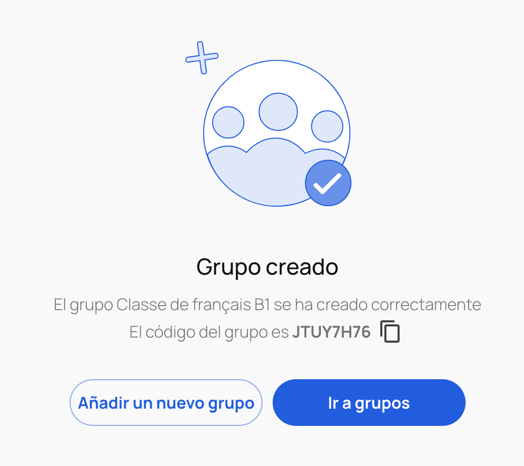 Después, verás una pantalla confirmando que el nuevo grupo se ha creado correctamente. Haciendo clic en el icono del portapapeles, podrás copiar el código del grupo y compartirlo con tus estudiantes. El código de grupo seguirá estando disponible después en la pestaña "Grupos".