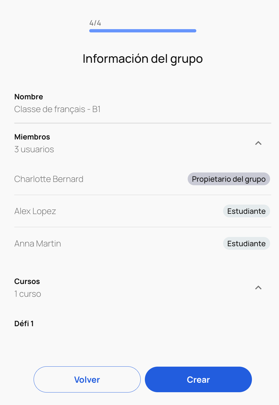 Tras hacer clic en "Continuar", verás un resumen de la información del grupo. Haz clic en "Crear" para completar el proceso o en "Volver" si deseas modificar alguno de los parámetros.