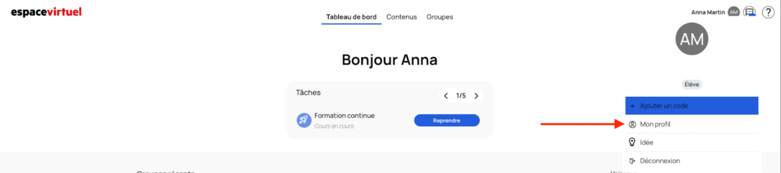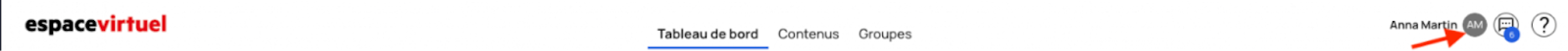3. Connectez-vous à l'Espace Virtuel depuis la version navigateur de votre ordinateur et cliquer sur l'icône avec vos initiales en haut à droite de votre écran, ensuite sur l'onglet « Mon profil » :