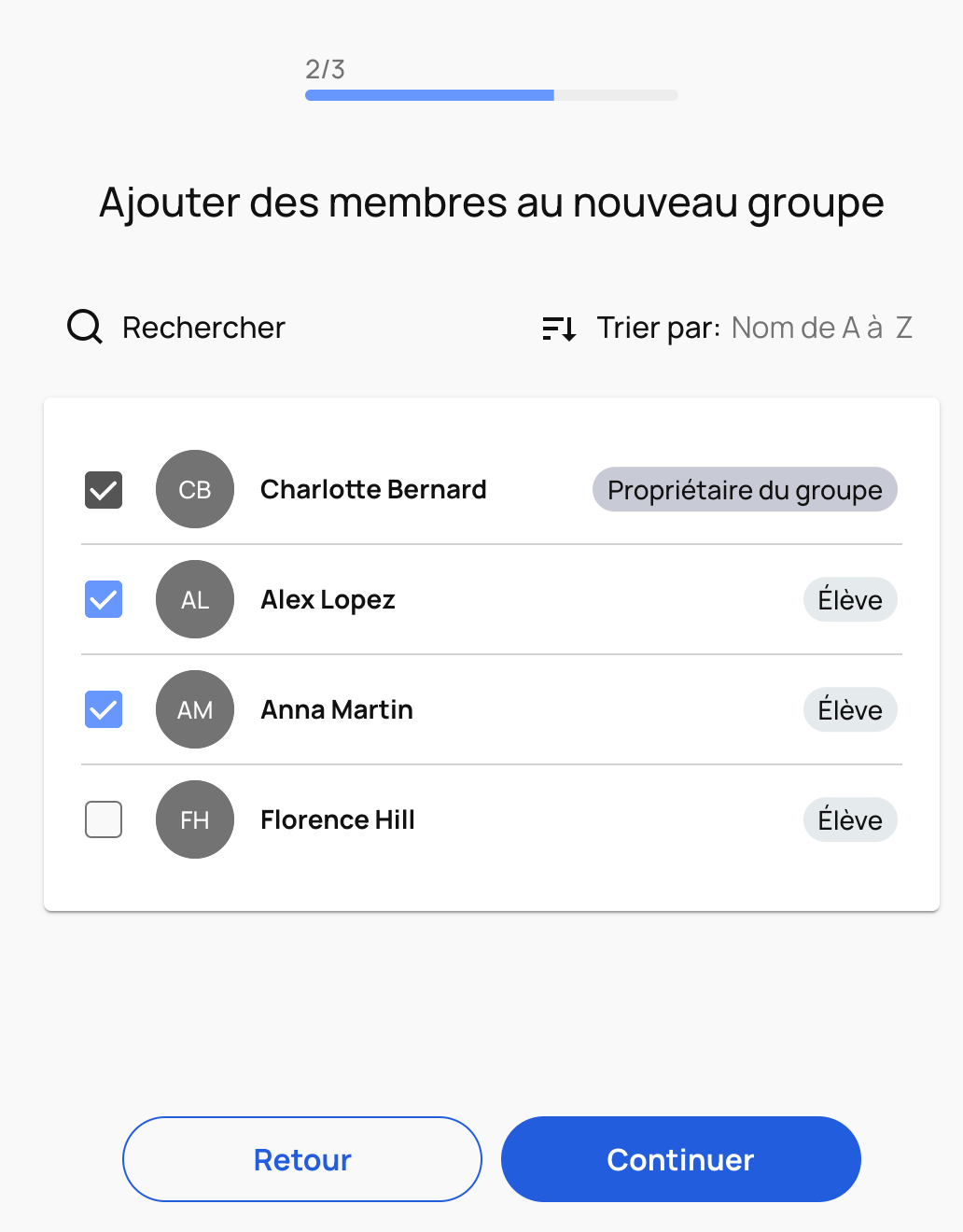 Après avoir cliqué sur « Continuer » , vous devrez ajouter des membres au nouveau groupe. Seuls les étudiants qui sont sur votre liste d'utilisateurs parce qu'ils appartiennent déjà à un autre de vos groupes apparaîtront ici. Si vous avez de nombreux élèves, vous pourrez les rechercher et les filtrer. Si vous n'avez pas encore d'étudiants faisant partie d'un groupe, ils n'apparaîtront pas ici. Dans ce cas, cliquez simplement sur « Continuer » et continuez à créer le groupe même si pour le moment, vous êtes le seul membre du groupe.
