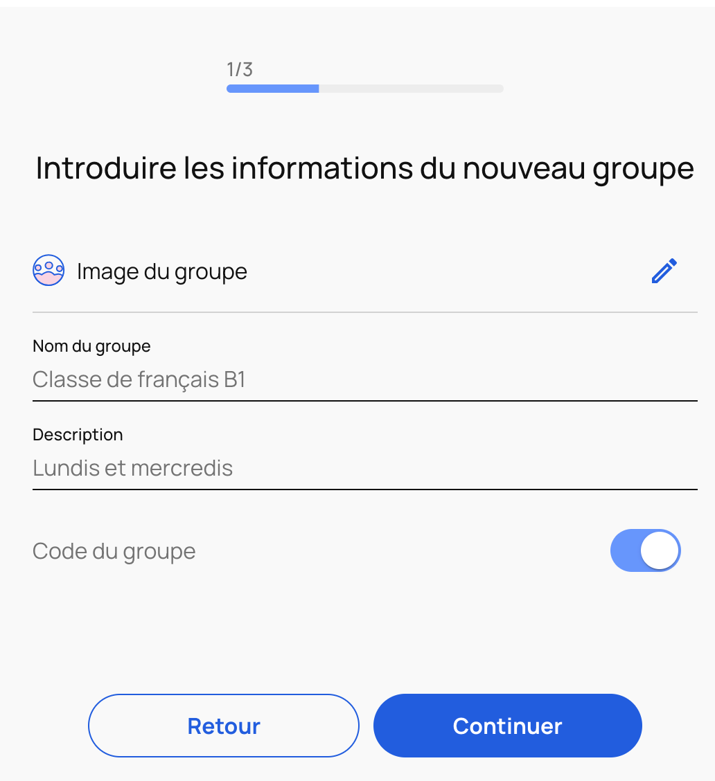 Une fenêtre s'ouvrira dans laquelle apparaîtront les instructions que vous devez suivre pour terminer la création de votre groupe. Tout d'abord, vous devrez choisir un nom pour le groupe. Il ne peut y avoir deux groupes portant le même nom sur la plateforme, évitez donc les noms trop génériques. Vous pourrez également ajouter une description pour le groupe et télécharger une image pour le groupe en cliquant sur l'icône en forme de crayon.