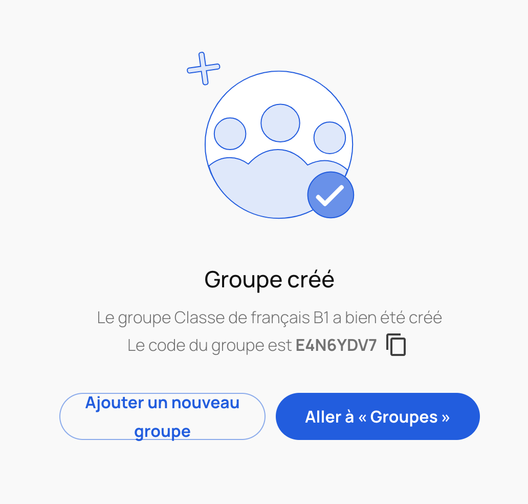 Vous verrez alors un écran confirmant que le nouveau groupe a été créé avec succès. En cliquant sur l'icône du presse-papiers, vous pourrez copier le code du groupe et le partager avec vos élèves. Le code de groupe sera toujours disponible par la suite dans l'onglet « Groupes » .