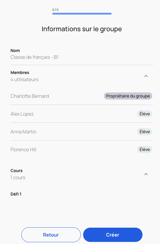 Après avoir cliqué sur « Continuer » , vous verrez un résumé des informations du groupe. Cliquez sur « Créer » pour terminer le processus ou sur « Retour » si vous souhaitez modifier l'un des paramètres.